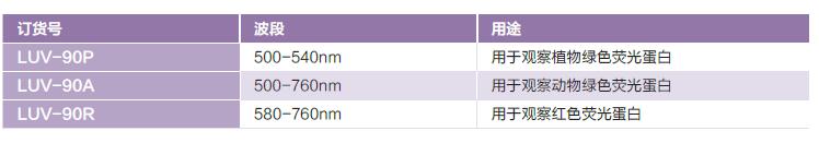 LUV-90熒光激發(fā)光源觀察眼罩會根據(jù)觀察對象選用不用波段的觀察眼鏡。總共分以下三種: