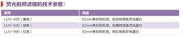 GFP熒光蛋白激發(fā)光源取照需要拍照濾鏡,熒光拍照濾鏡直徑為62mm,能夠適配62mm鏡頭的單反相機。