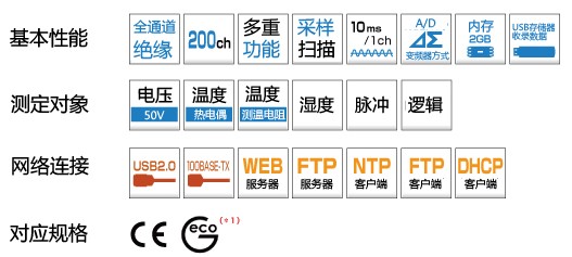 ※20ch端子、1秒取樣、主機存儲器収錄、使用2個新品電池組、+25℃環境