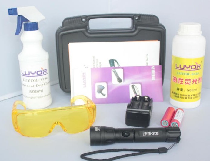 500ml luyor-6100油性濃縮熒光檢漏劑,500ml染料清洗劑,LUYOR-3130紫外熒光檢漏燈,充電器,充電電池,LUV-30熒光增強(qiáng)防護(hù)眼鏡,熒光劑添加標(biāo)簽,手提箱